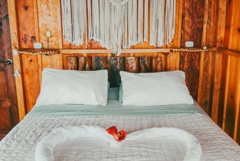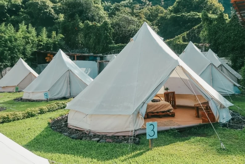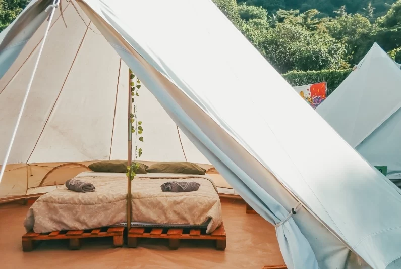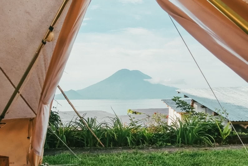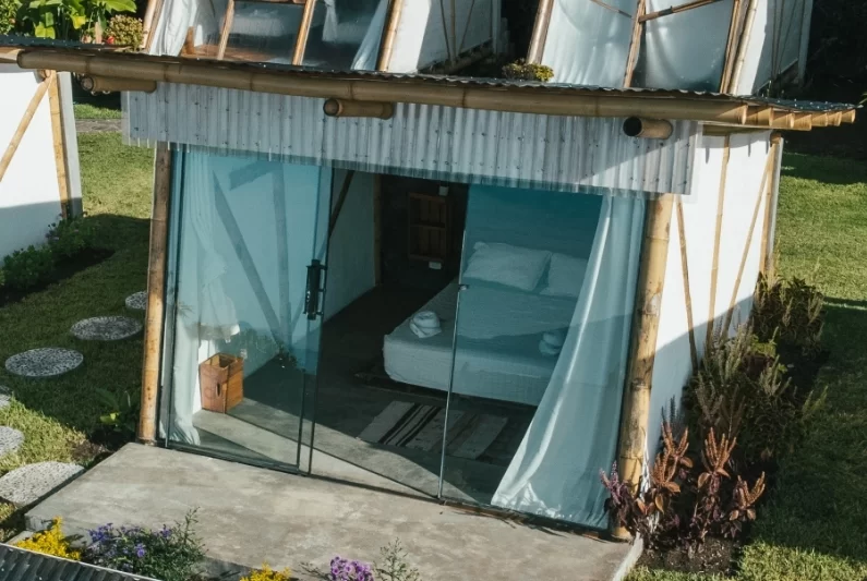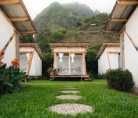For glampers who like a few more walls. These casitas sleep 2-3 guests with a queen bed (plus a single in the larger layout). Floor-to-ceiling windows bring the lake and volcano views straight to your bed, with a private patio for morning coffee or sunset drinks.