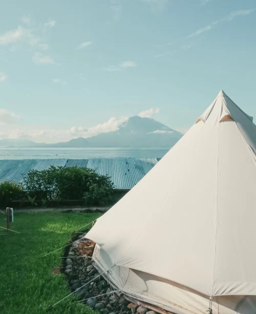 Fully outfitted canvas tents with sweeping lake and volcano views right outside your zippered door. Sleeps two in a queen bed or add a single to fit three. Comes with soft lighting, charging outlets, and all the cozy glamping feels.
